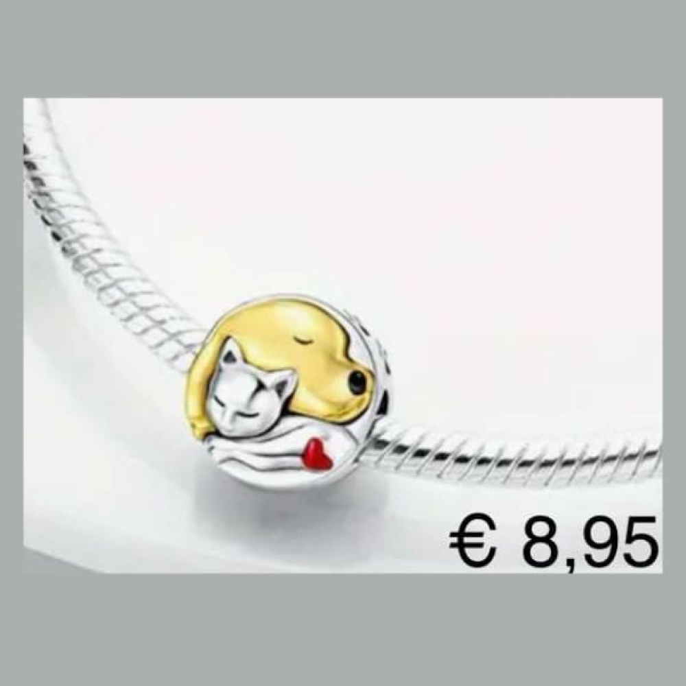 Zilveren kraal met goudkleurige hond en zilveren kat, aan de zijkant zitten pootafdrukken.