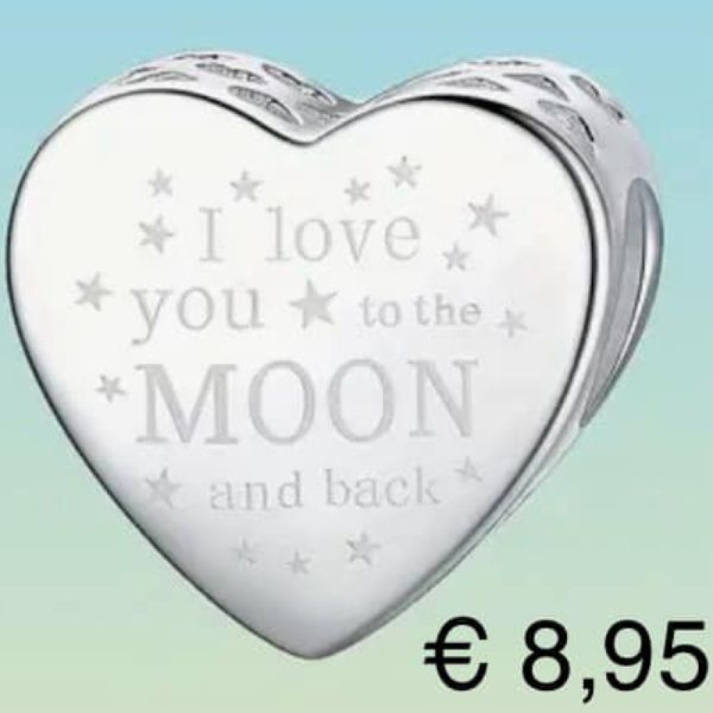 Zilveren liefdes hart met de tekst love you to the moon and back.
