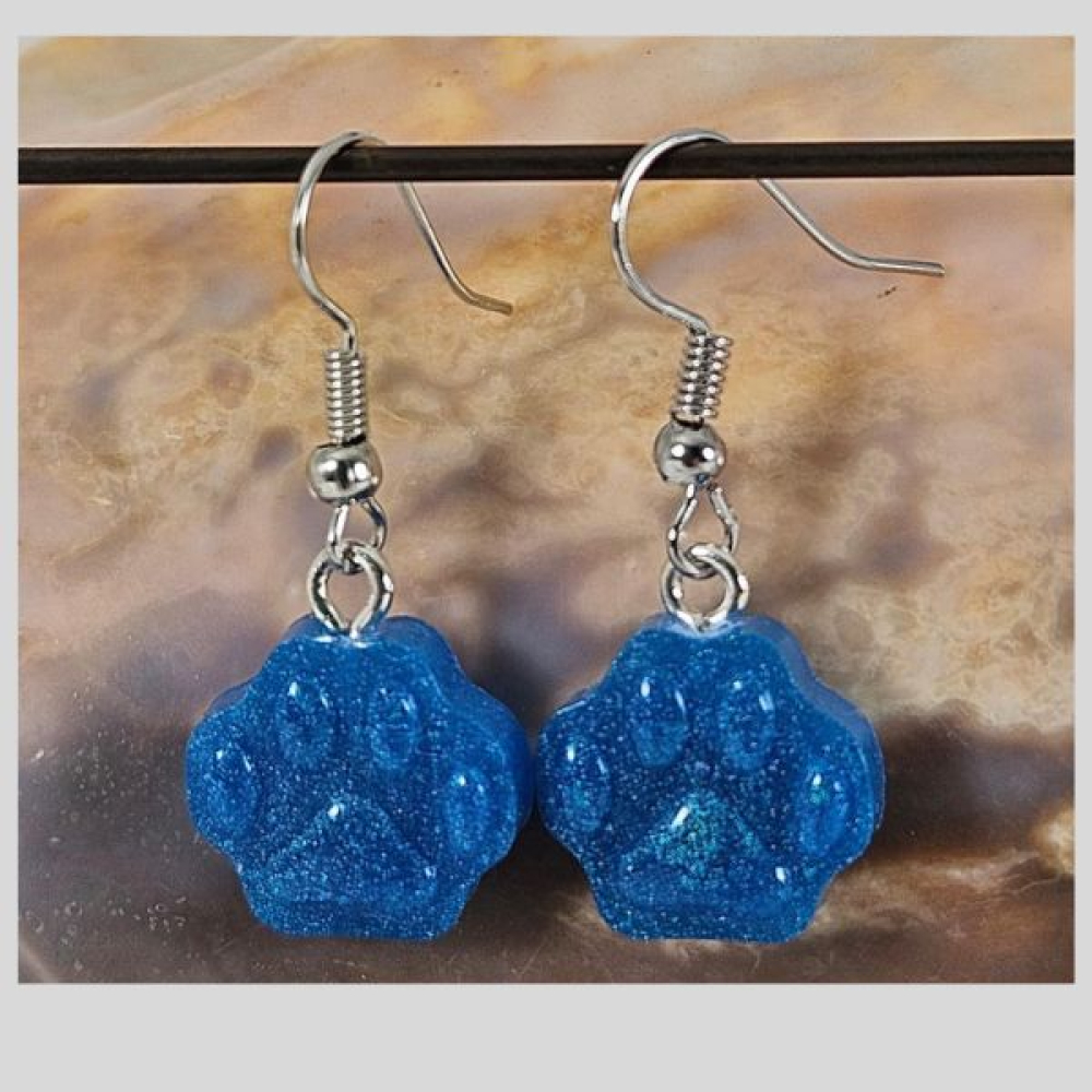Oorbellen met blauwe epoxy pootafdruk.